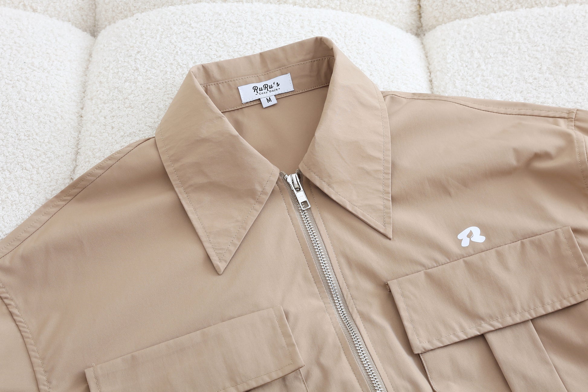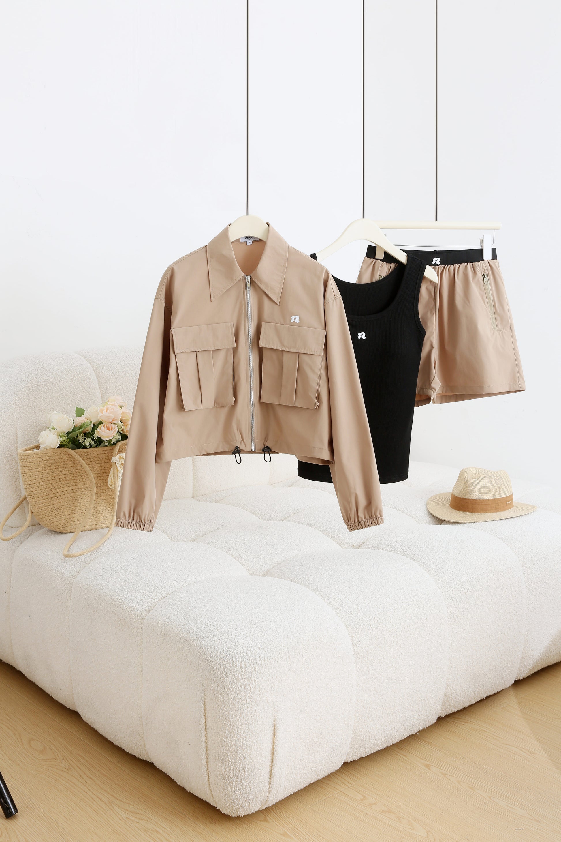 The set includes a lightweight zip-up jacket with utility-style pockets and gently gathered cuffs, a soft and breathable tank top with a clean neckline and subtle “R” embroidery, and relaxed elastic-waist shorts with practical zippered pockets. Thoughtfully designed details allow the pieces to move with you and suit every part of your day, whether lounging at home, stepping outside, or travelling.