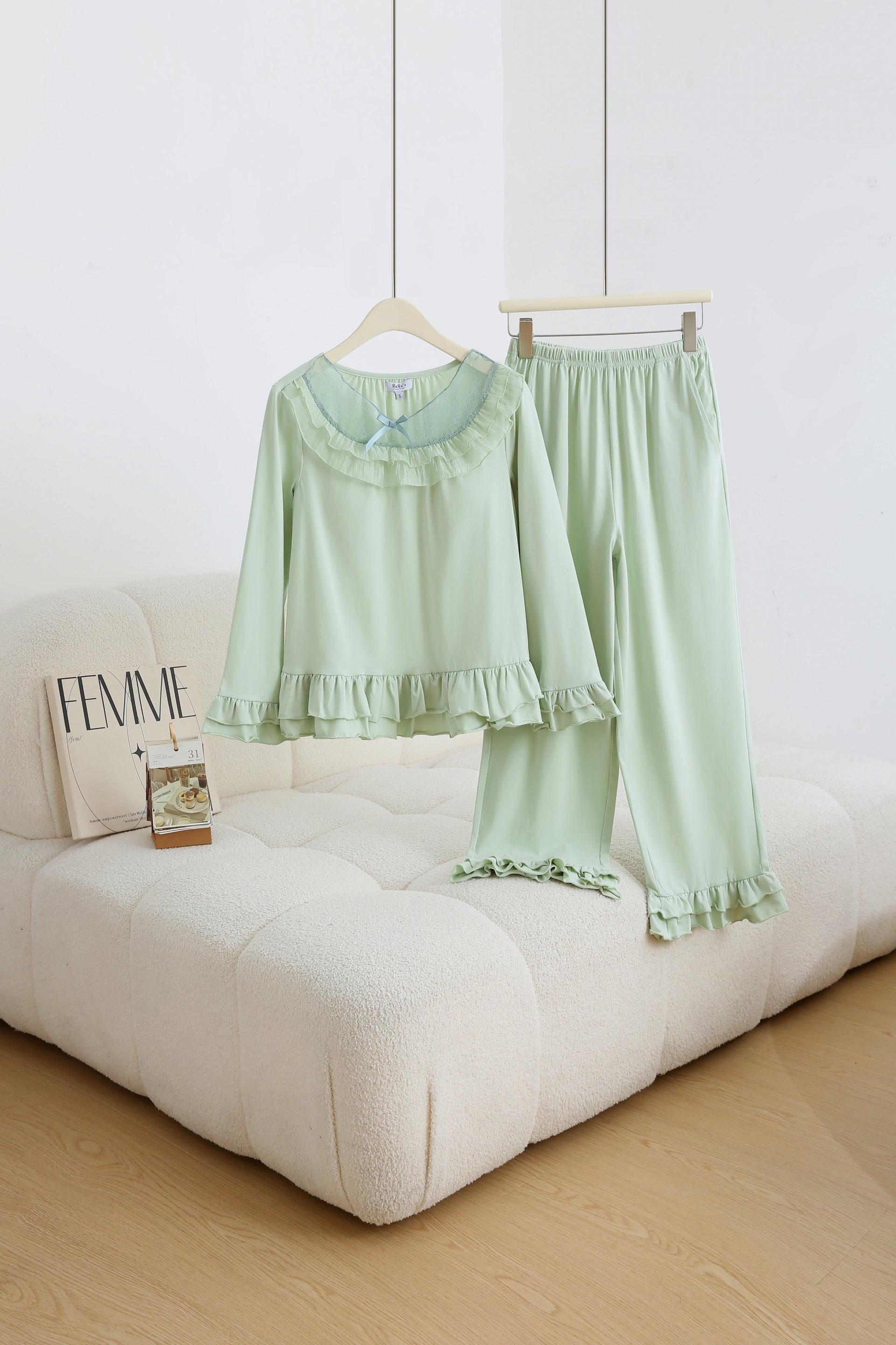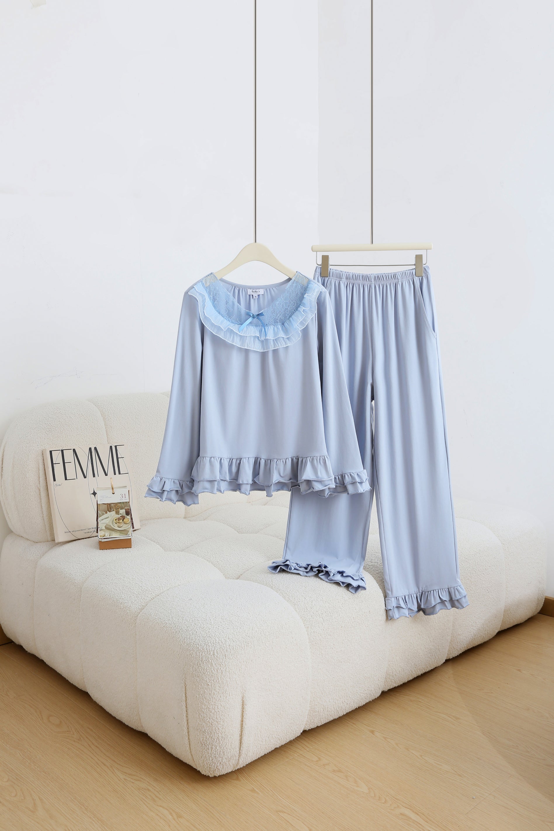 ☁️ Designed for real life at home, this beautifully detailed set blends delicate lace and gentle ruffles with a relaxed silhouette that feels as graceful as it looks. Crafted from lightweight, silky-soft fabric, it drapes effortlessly over your body, offering all-day comfort — from morning coffee moments to quiet nights in.