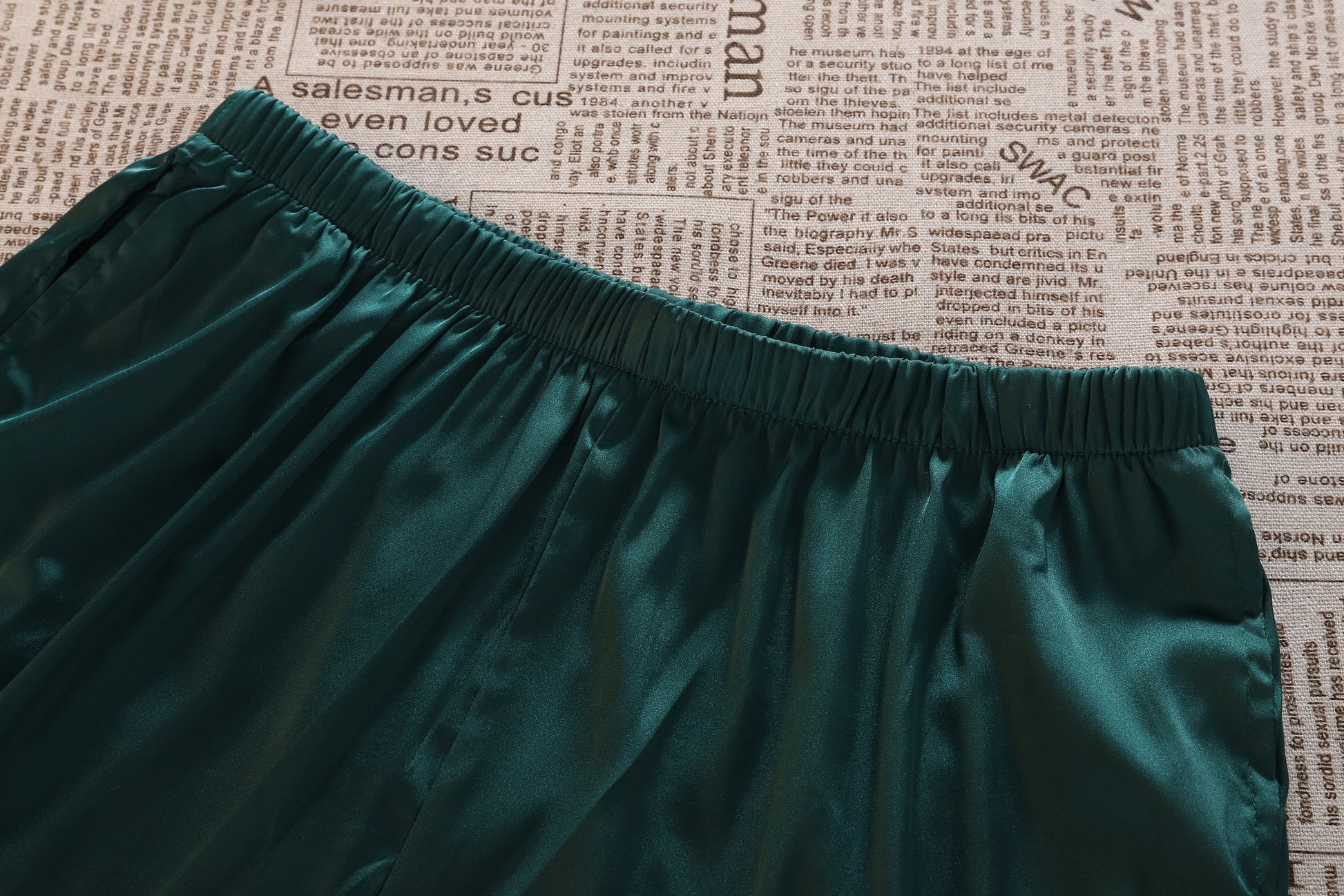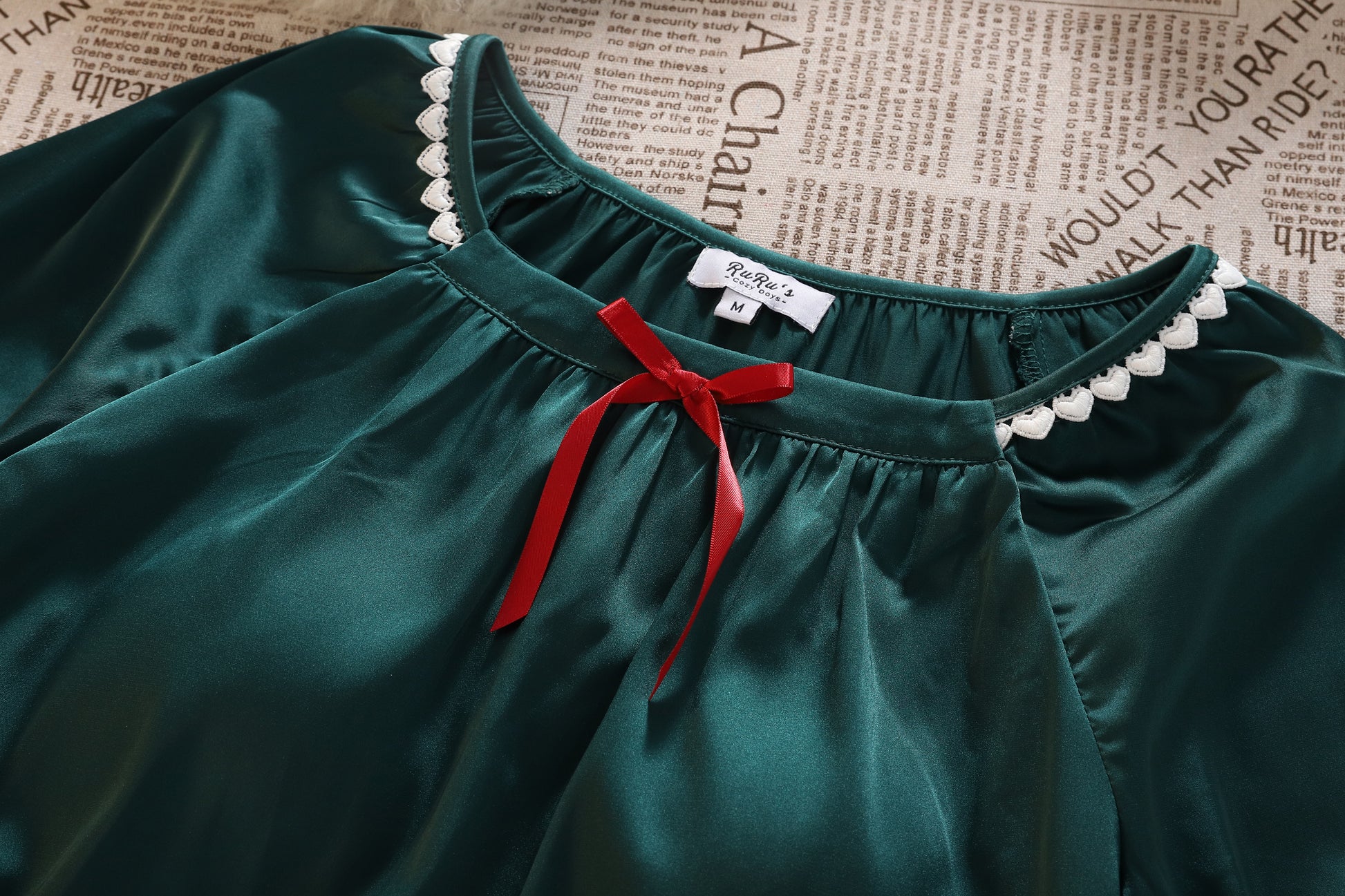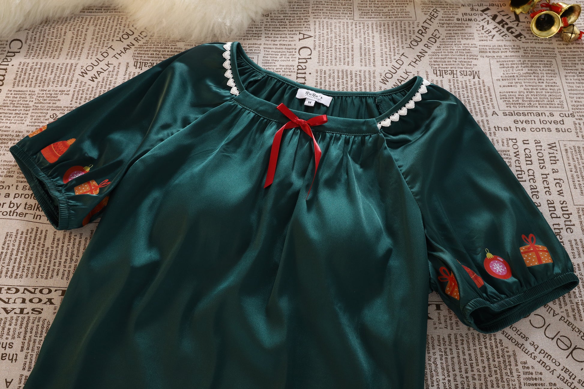 Made from silky-soft satin with subtle sheen, it features delicate holiday embroidery at the sleeves and shorts hem, finished with a contrasting ribbon bow — the perfect blend of elegance and playfulness.
