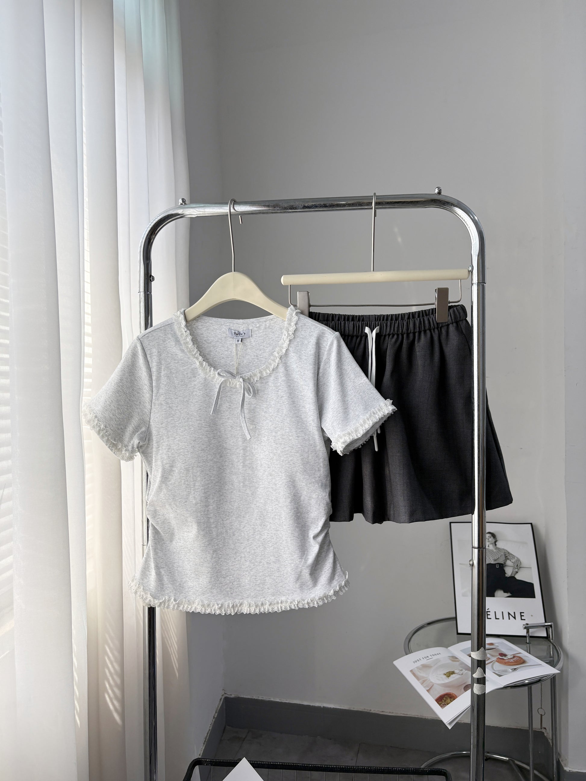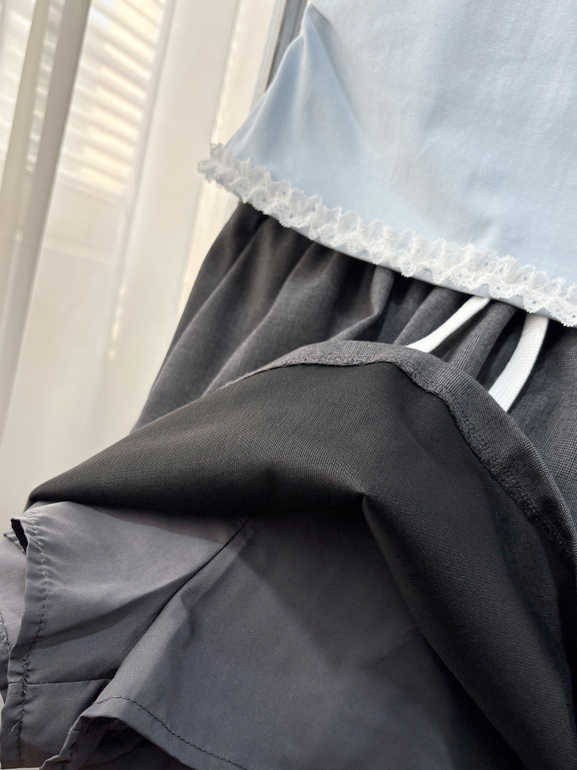 This two-piece set features a short sleeve top with delicate lace trims and a matching skirt, combining comfort with a refined, feminine touch. The breathable fabric feels gentle against the skin, while the lace details add subtle elegance — perfect for relaxing at home, slow mornings, or cozy evenings.